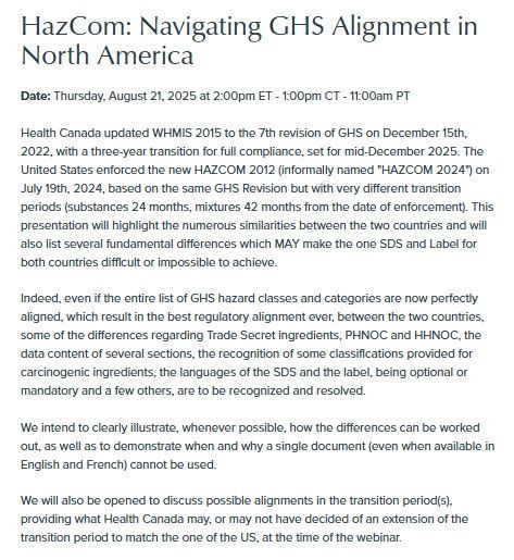 With both Canada and the U.S. updating their hazard communication regulations to GHS Revision 7, this webinar explores the critical similarities and key regulatory differences that may impact the feasibility of a single SDS and label across both countries. Attendees will gain expert insights into Trade Secrets, PHNOC/HHNOC classifications, SDS content variations, language requirements, and transition timelines—plus practical strategies to navigate compliance challenges on both sides of the border.